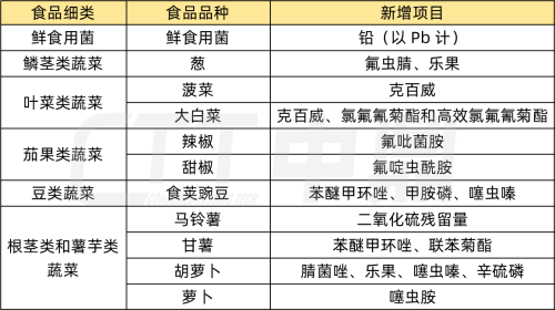 涉及鲜食用菌(无机砷)、韭菜(氟虫腈、六六六、三氯杀螨醇、水胺硫磷)、菠菜(甲氨基阿维菌素苯甲酸盐、乐果、水胺硫磷、乙酰甲胺磷)、油麦菜(克百威、三氯杀螨醇)、豇豆(氯氰菊酯和高效氯氰菊酯)、马铃薯(杀扑磷)等。