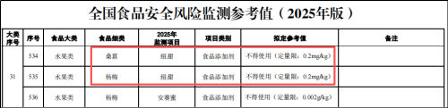 纽甜属于高倍甜味剂,根据GB 2760-2024《食品安全国家标准 食品添加剂使用标准》规定新鲜水果不得使用纽甜。但个别商家为掩盖桑葚、杨梅的酸涩口感、提升卖相,存在超范围浸泡添加的违规行为。因此2026年版国抽细则将纽甜从“风险监测”正式纳入“监督抽检”。