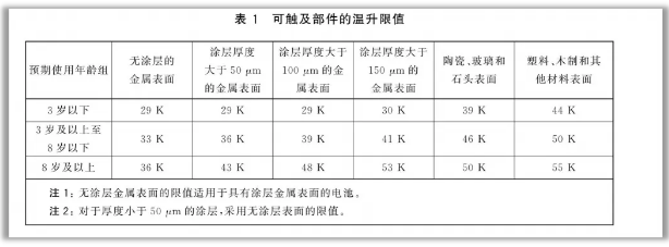 ● 电玩具在使用中,温度不应过高。电玩具的可触及部件包括手柄、旋钮等的表面温升不应超过表1规定的值: